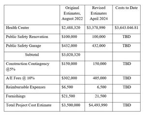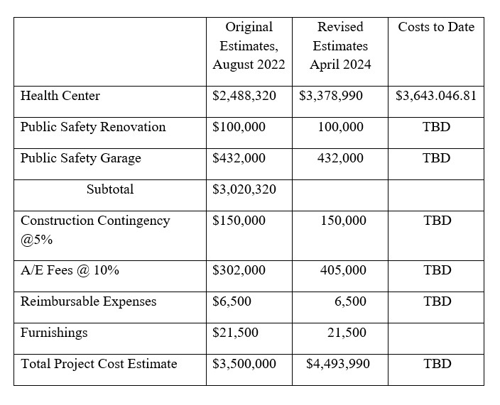 In August 2022, the cost estimate for the three-part project was $3,500,000 - $2,488,320 for the Health Center building, $100,000 to renovate the Public Safety space in the Municipal Building, and $432,000 for the up-island Public Safety Garage. In March 2024, once construction had begun, the Health Center budget was increased by $866,332 to $3,378,990, for a total MBP cost of $4,493,990. The final costs of the MBP will be known once the up-island garage has been built and the space for Public Safety in the Municipal Building has been renovated.